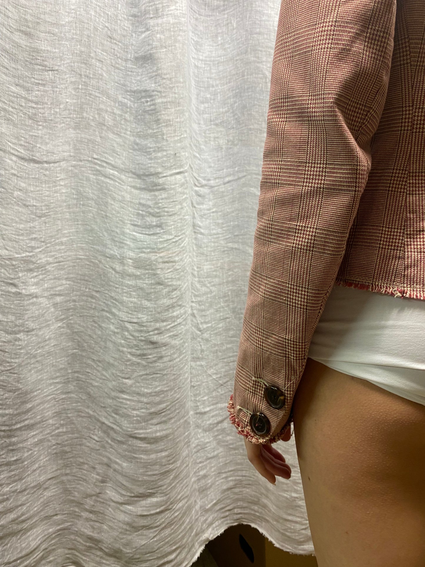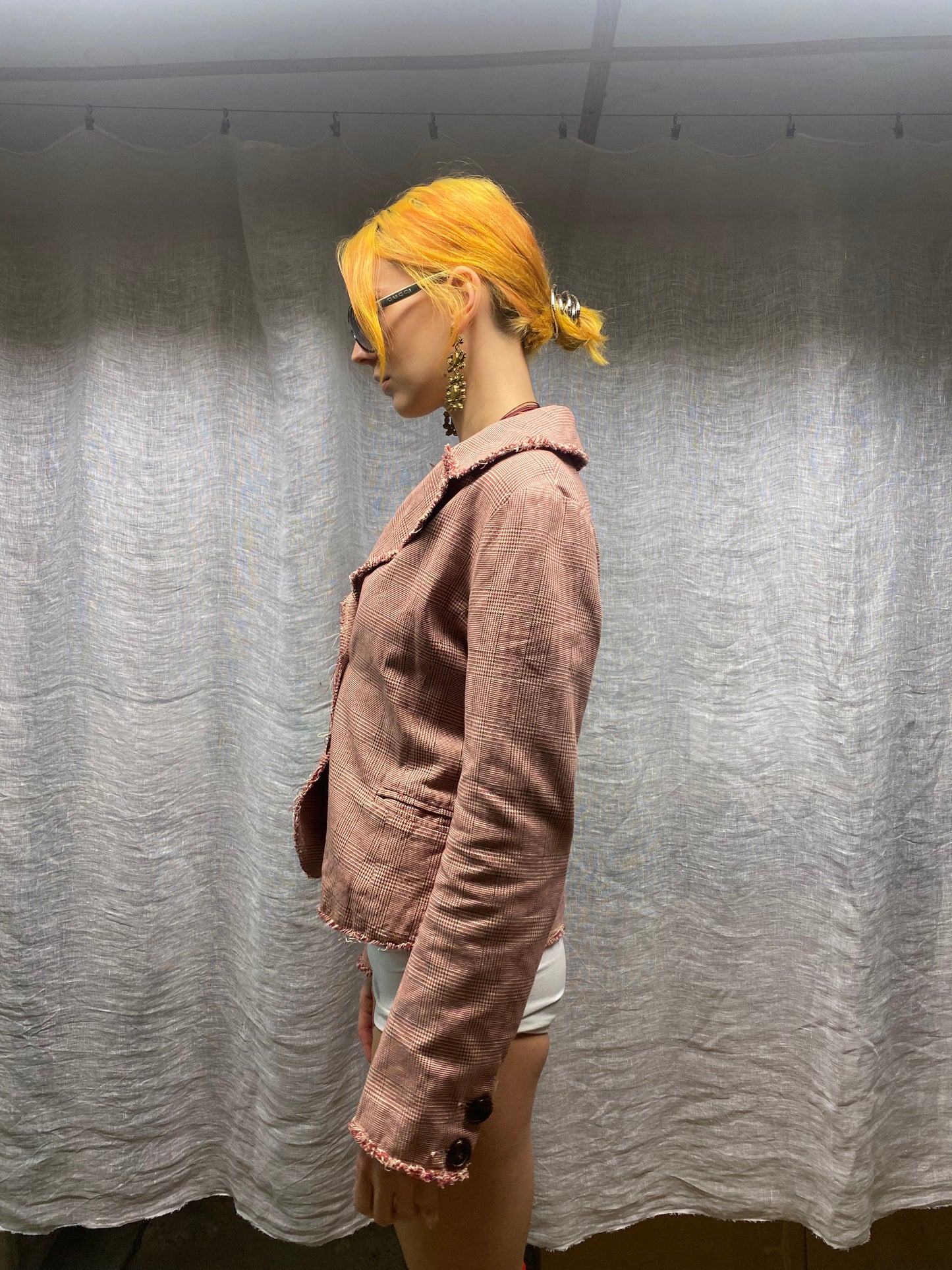 Red tweed-style jacket with check